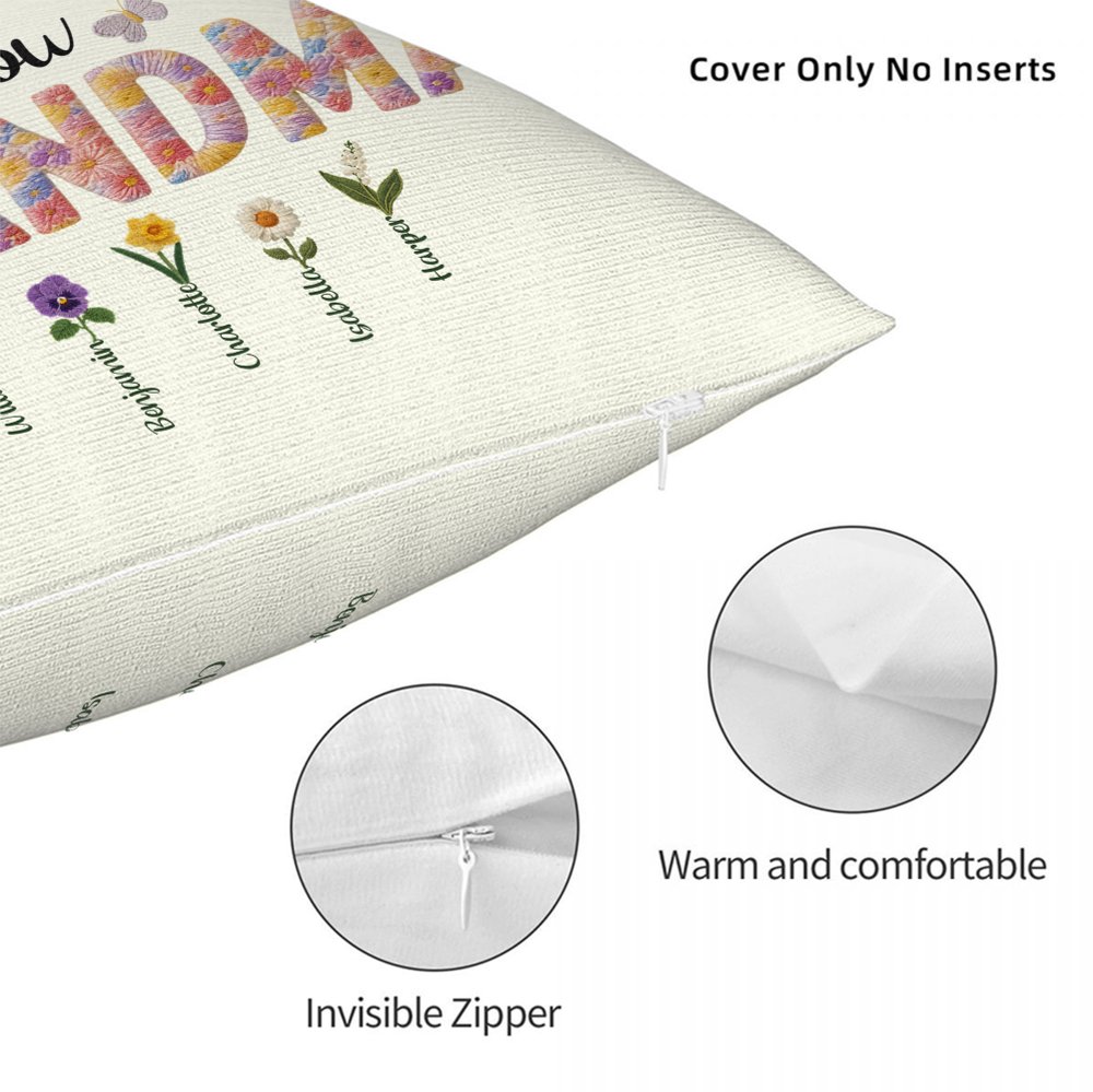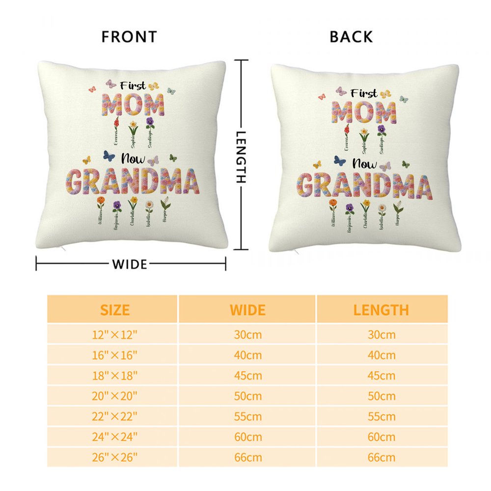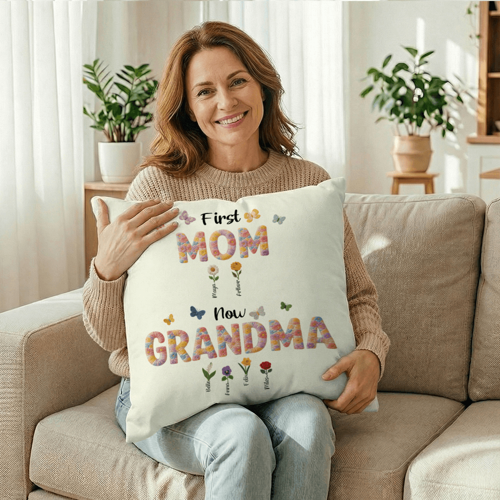 This charming throw pillow features a whimsical faux-yarn birth flower design, centered around the heartfelt phrase "First Mom, Now Grandma". Each letter is filled with vibrant, textured floral patterns, paired with custom birth flowers and names for every grandchild, plus delicate butterfly accents for a warm, playful touch. Fully customizable to your family, it turns a simple home decor piece into a one-of-a-kind tribute to a mother’s journey from mom to grandma, celebrating every generation with love.